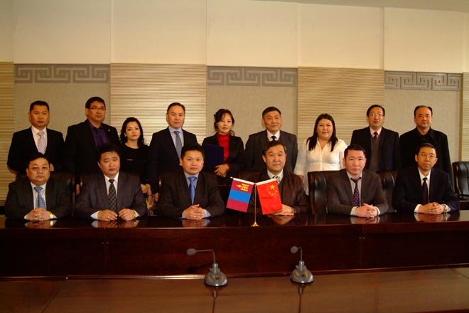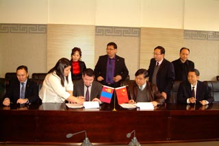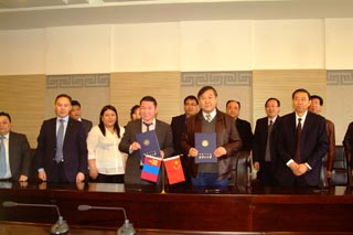 蒙古國執(zhí)行機(jī)構(gòu)汽車運(yùn)輸局副局長納•普恩查格(前排左三) 學(xué)校副校長齊木德道爾吉(前排右二)學(xué)院院長柴金義(前排右一)簽署協(xié)議