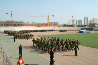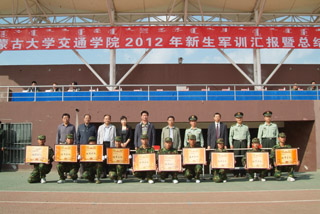 2012年9月6日,學(xué)院2012級新生軍訓(xùn)圓滿結(jié)束并在南校區(qū)操場舉辦了新生軍訓(xùn)匯操暨表彰大會。中國人民解放軍某部隊教導(dǎo)員鄧愛民,呼和浩特市玉泉區(qū)人民武裝部政委王宏勝,內(nèi)蒙古大學(xué)學(xué)工處副處長、學(xué)生資助管理中心主任王燁輝,呼和浩特市玉泉區(qū)人民武裝部參謀張宇峰,我院院長柴金義,常務(wù)副院長董平,黨委副書記、紀委書記白托婭,副院長武鈞,黨委委員、科研處處長李宏,黨委委員、教務(wù)處處長趙志蒙及各系黨總支書記出席了大會并為獲獎連隊及個人頒獎。新生軍訓(xùn)教官、班主任、學(xué)工處(團委)老師和1100名新生參加了表彰大會。大會由學(xué)工處副處長馮俊杰主持。
