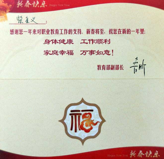 2013年2月6日,教育部副部長魯昕給我院柴金義院長發(fā)來新年賀卡,表達(dá)了對(duì)我院的關(guān)心、問候。上級(jí)領(lǐng)導(dǎo)的關(guān)懷使我們倍受鼓舞!新年伊始,新學(xué)期到來之際,我們?cè)敢詬湫碌拿婷?、更佳的狀態(tài),努力工作,勤奮進(jìn)取,使學(xué)院發(fā)展建設(shè)事業(yè)取得新的成績。