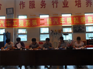 為了豐富學(xué)院大學(xué)生的課余生活,展示當(dāng)代大學(xué)生的精神面貌及自身素質(zhì),培養(yǎng)大學(xué)生把理論運用于實踐的能力,我院汽車工程系在豐田實驗室舉辦“第二屆汽車模擬銷售大賽”。 汽車工程系副主任李政、黨總支書記鐘懷軍、主任助理李春芾、學(xué)工辦主任姚延剛、學(xué)生會主席孫榮欣擔(dān)任大賽評委。