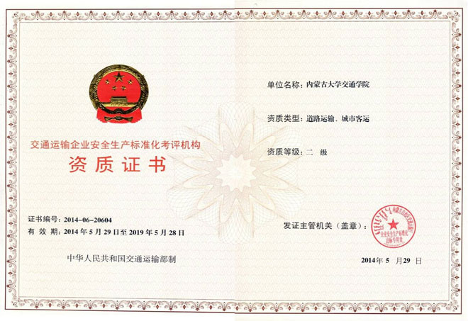 根據(jù)《內(nèi)蒙古自治區(qū)交通運輸廳關(guān)于公布第二批交通運輸企業(yè)安全生產(chǎn)標準化考評機構(gòu)的通知》,我院于2014年5月30日被認定為自治區(qū)第二批交通運輸企業(yè)安全生產(chǎn)標準化二級考評機構(gòu),承擔(dān)自治區(qū)范圍內(nèi)道路運輸與城市客運類企業(yè)的安全生產(chǎn)標準化建設(shè)二級達標考評工作,資質(zhì)證書的有效期五年。目前自治區(qū)交通運輸廳已批準成立4家二級考評機構(gòu),負責(zé)對道路運輸、城市客運、交通運輸工程建設(shè)等5個專業(yè)類型的企業(yè)進行安全生產(chǎn)標準化建設(shè)達標考評。